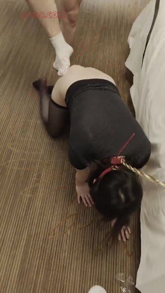 标准的小狗爬,前面被老公用链子牵着,后面被主人赶着爬到床边。